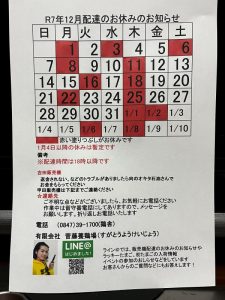 12月販売機配達お休み