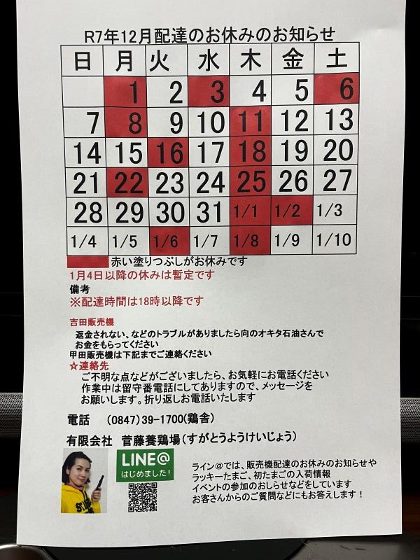 - ふみちゃん家のたまご自販機12月配達お休みのお知らせ - 2025年12月1日