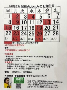 2月の配達お休み